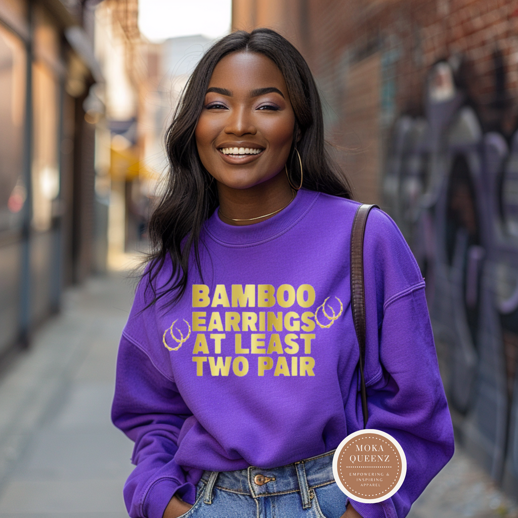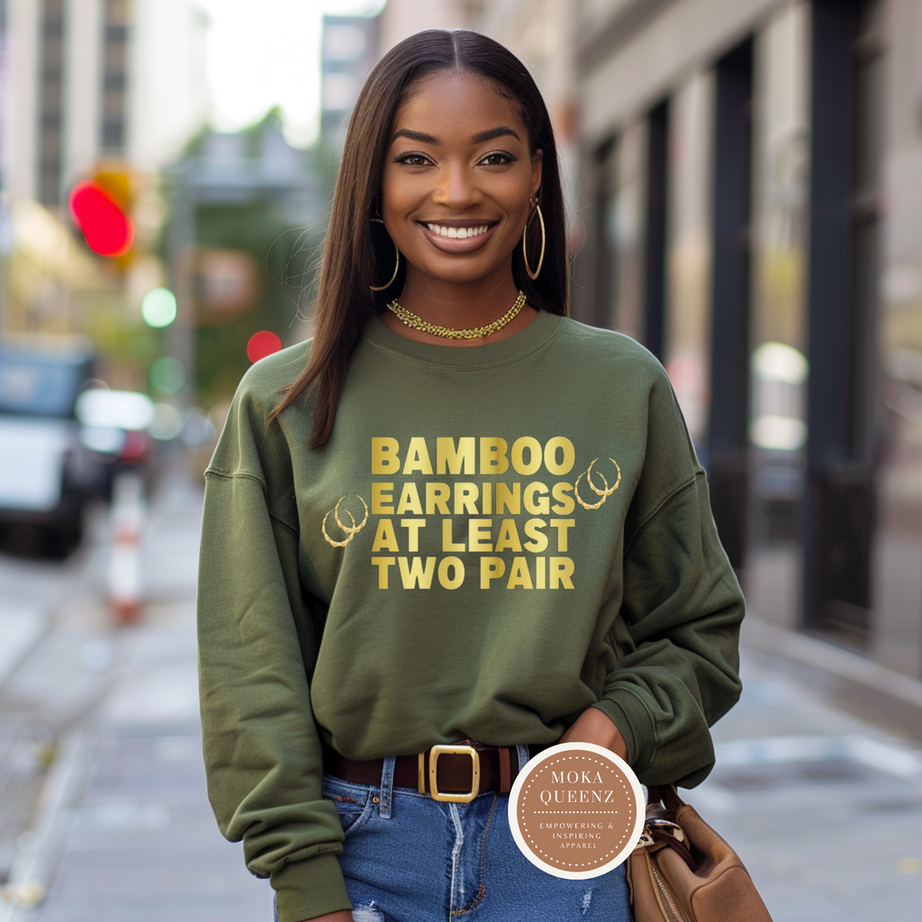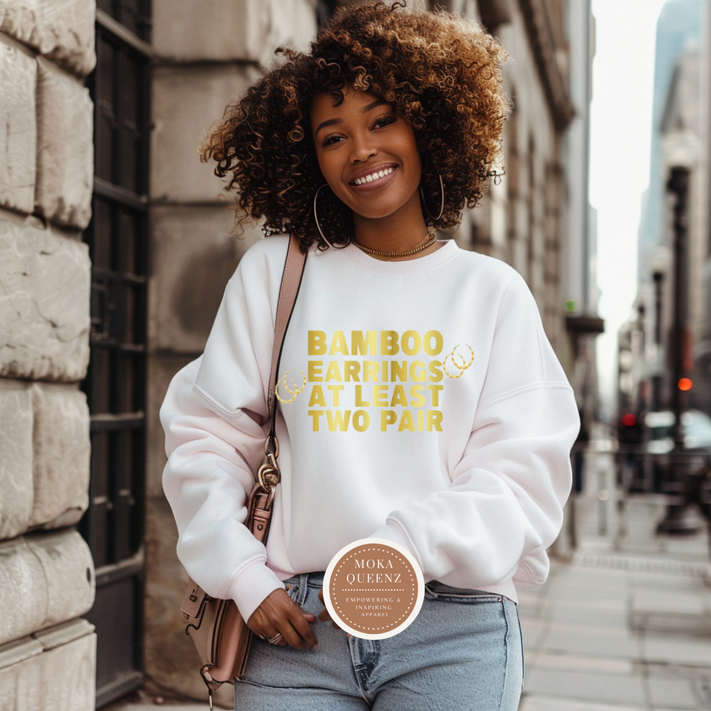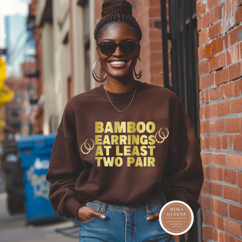 Channel the essence of old-school hip-hop with our “Bamboo Earrings At Least Two Pair” Sweatshirt. Inspired by iconic 80s lyrics, this graphic is more than fashion—it’s culture, history, and empowerment.
