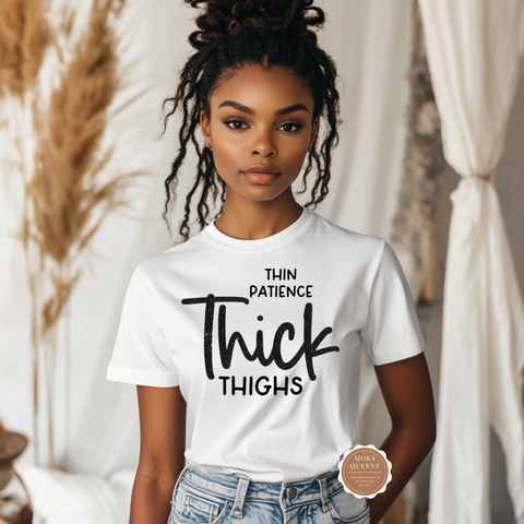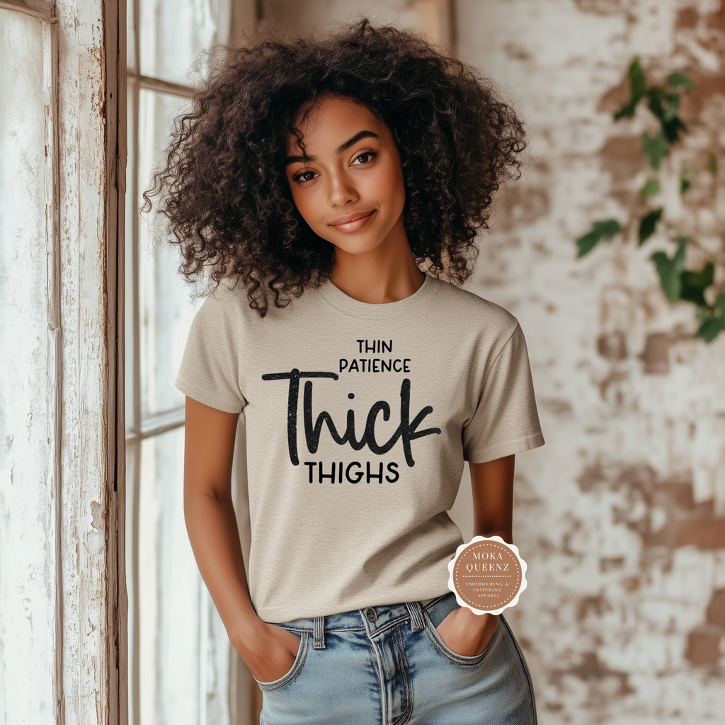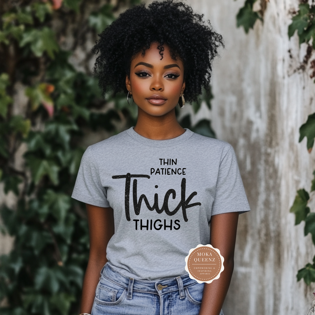 For the women who keep it real — this Thin Patience, Thick Thighs T shirt says it all!
